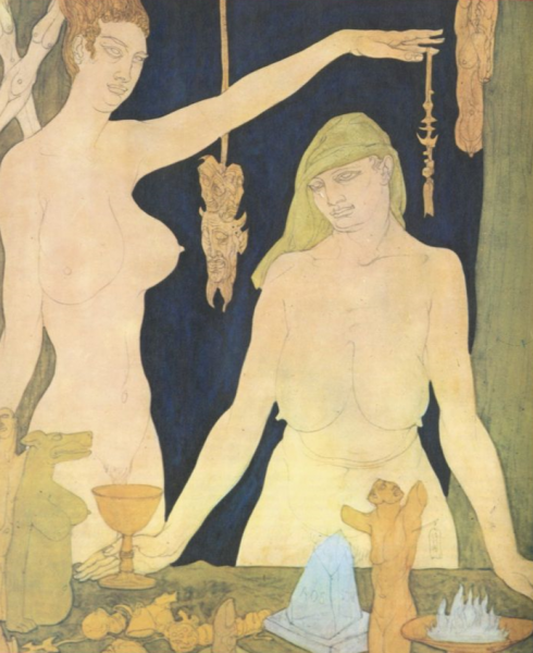 Left A painting of witches, by the English occultist and artist Austin Osman Spare. Their paraphernalia includes a figure with a pin stuck into it, and imitative magic of this type, meant either to kill or to seduce, is known from all over the world and all through history. It has its roots in the experiences of childhood, when a child believes that a doll is a real person and can be cosseted or hurt.