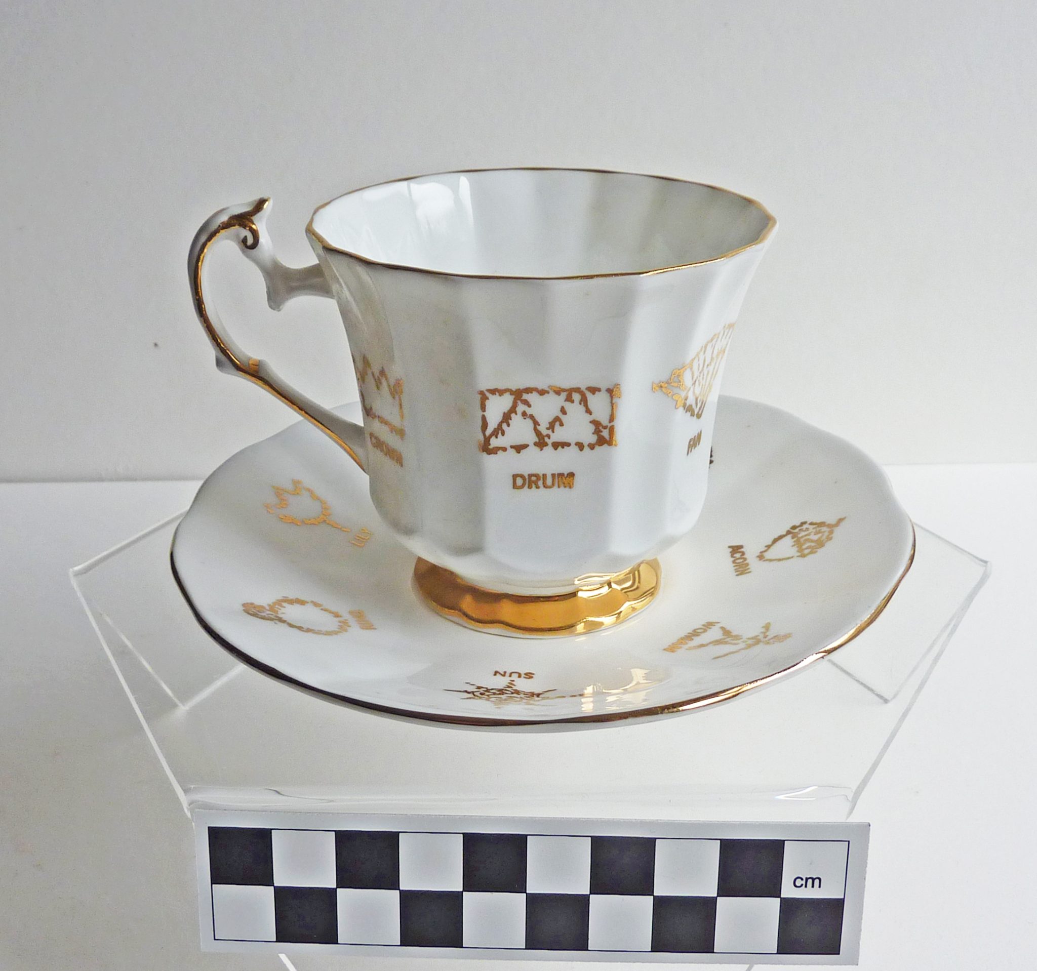 - White and gold fortune telling cup and saucer, with pictures depicting tea-leaf shapes. Elegant shape with fluted cup. 1960s, made by Taylor & Kent.