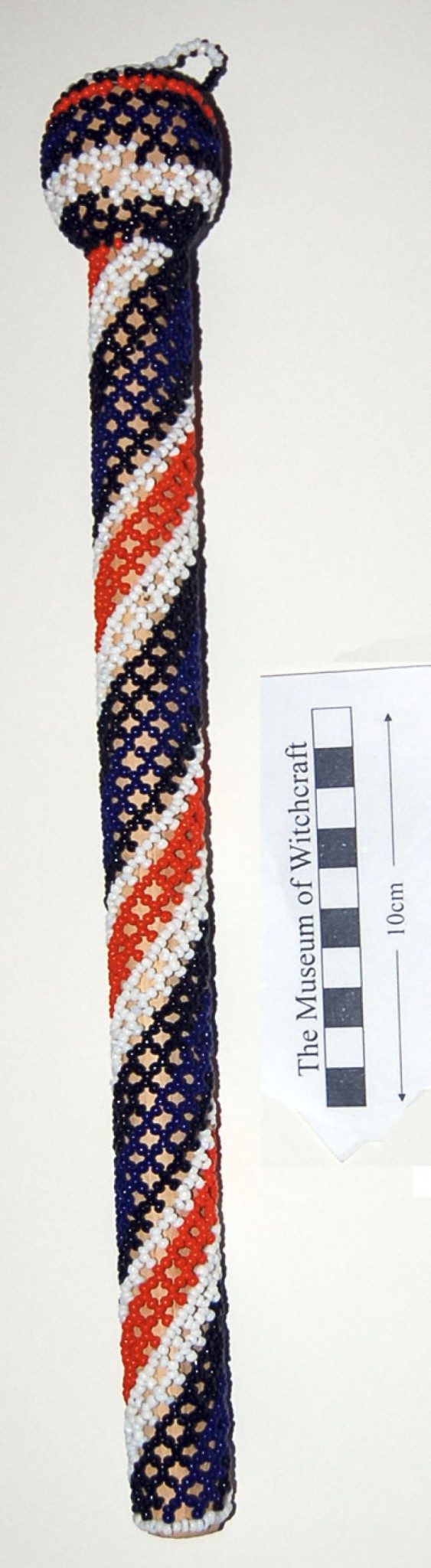 - A wooden beaded dancing stick with bobble on the end, covered in diagonal beaded design in black, blue, orange & white. Used by females, male version has arrow on top.