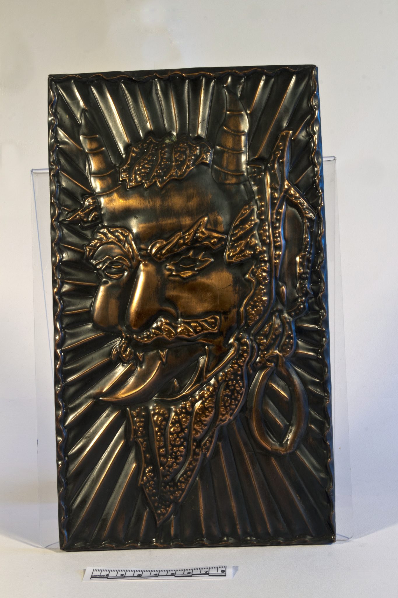 Copper plaque of a devil's face. Rather humorous - the devil is sticking his tongue out and has a large earring in his ear.
