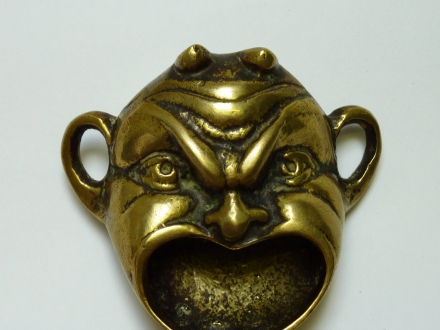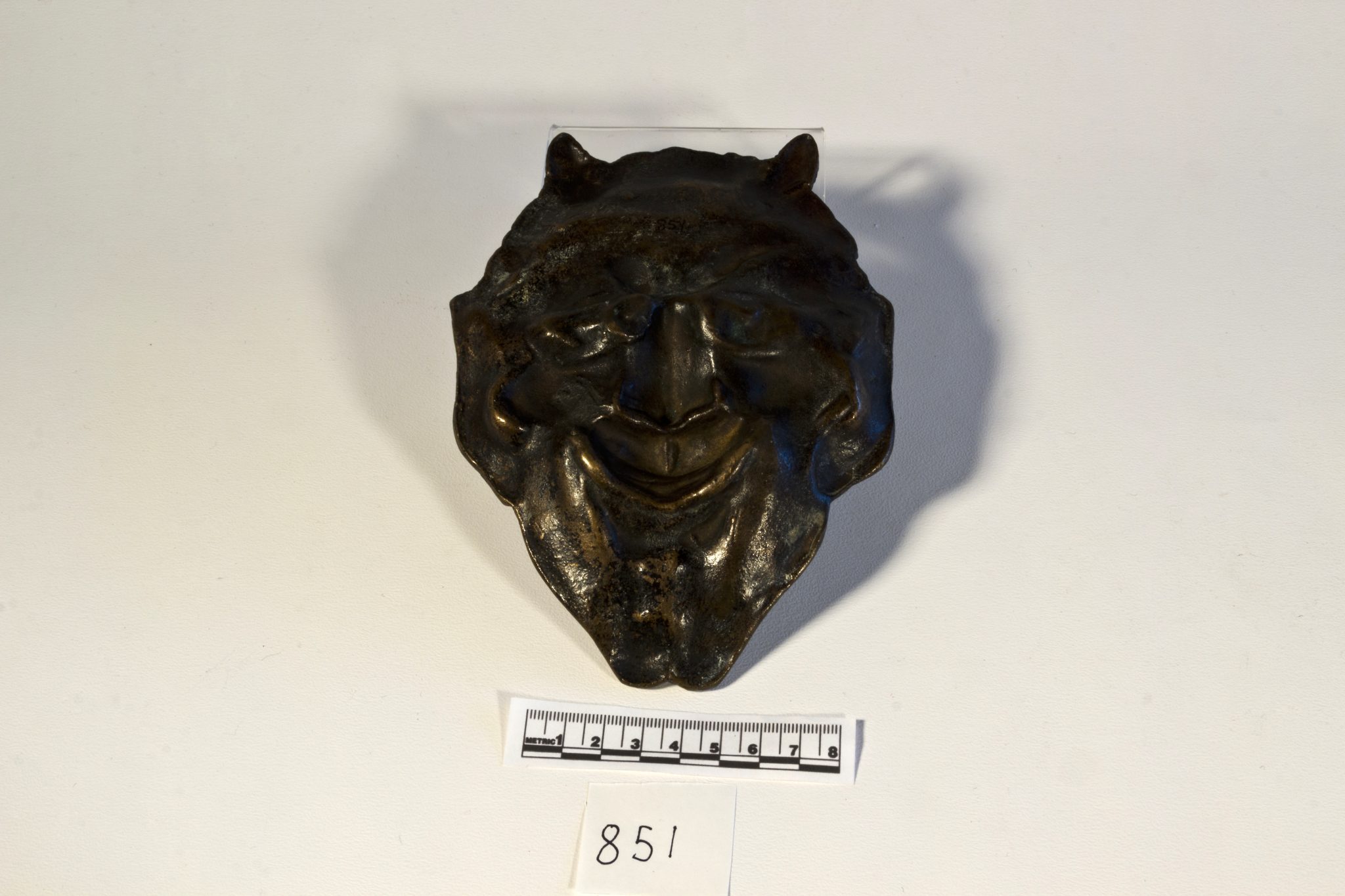 - A cast, brass dish depicting a horned face. The donor says that he obtained this plate from a Satanist who used it as an incense burner.