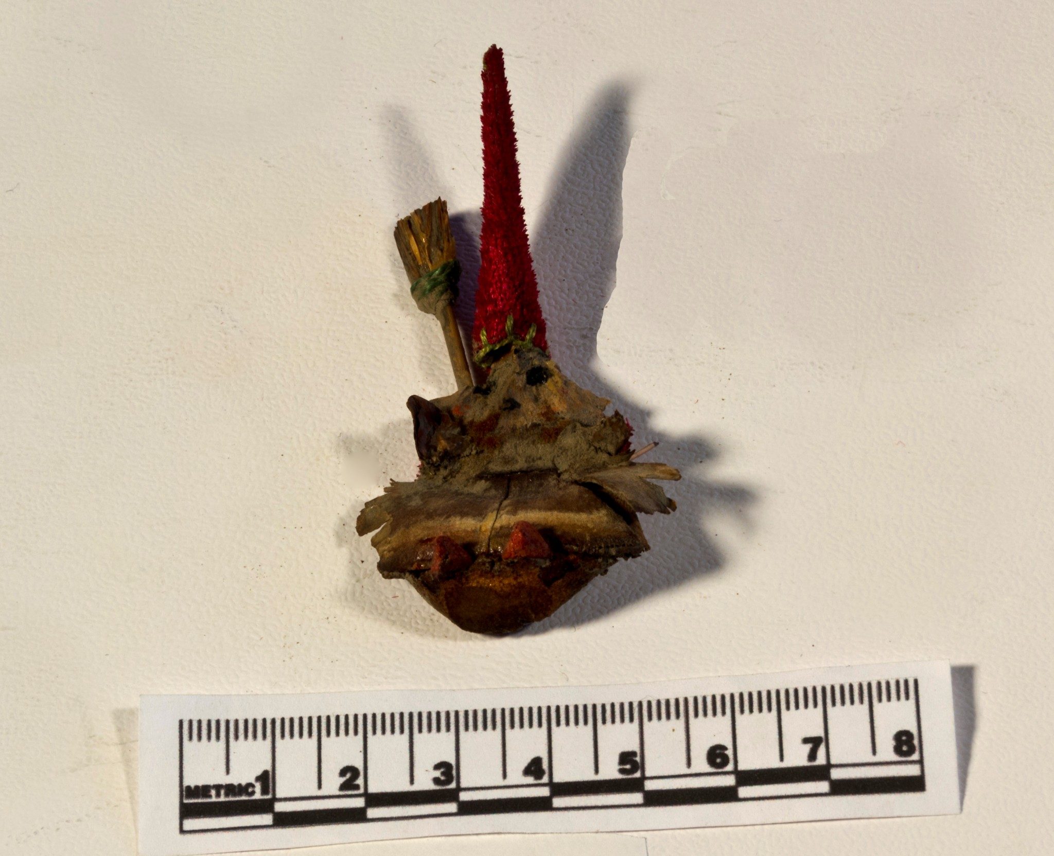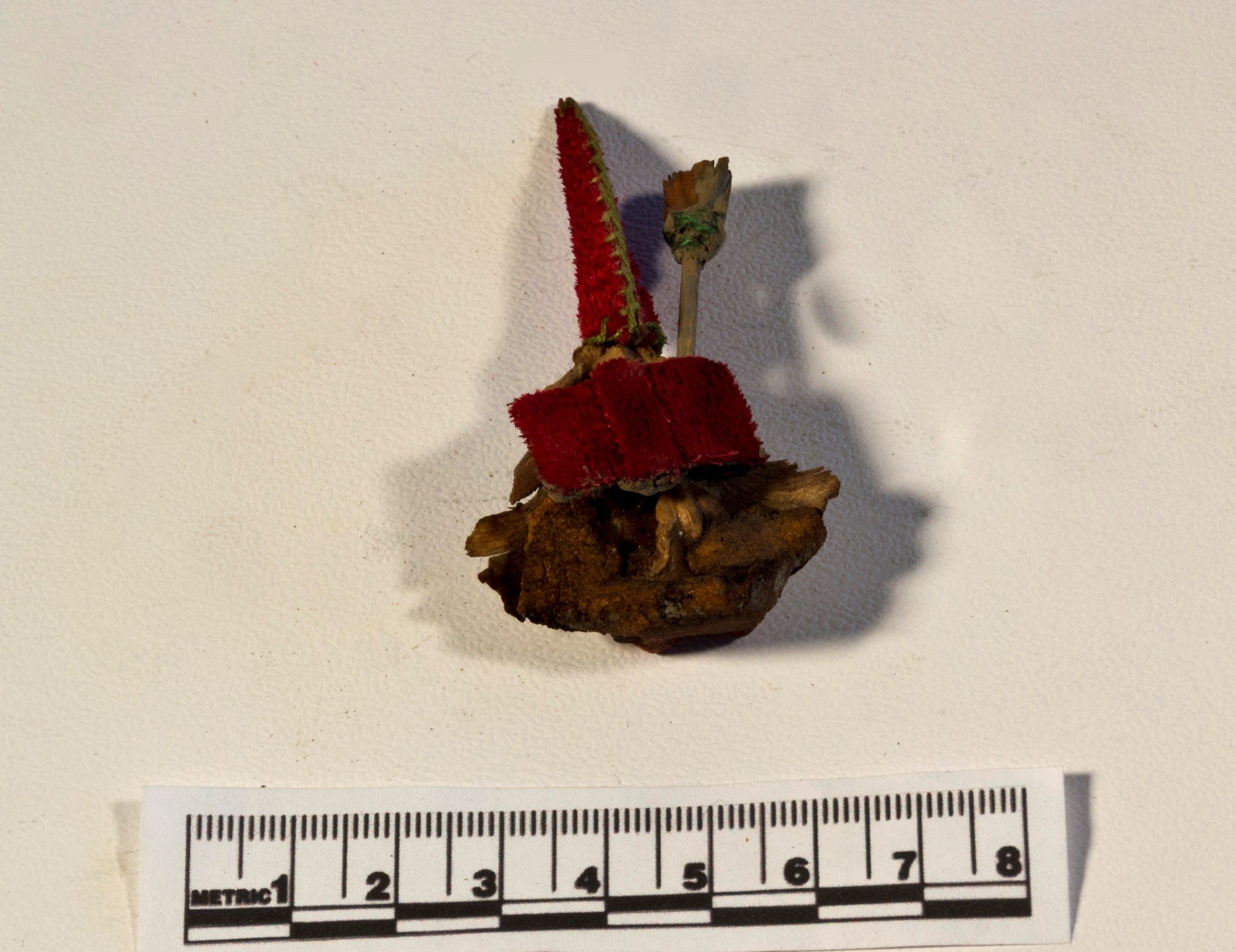 - Large fir cone segment made into a witch. Red velvet pointy hat. Small red feet, face is vague, broomstick made out of a stick, possible grass seed brush.