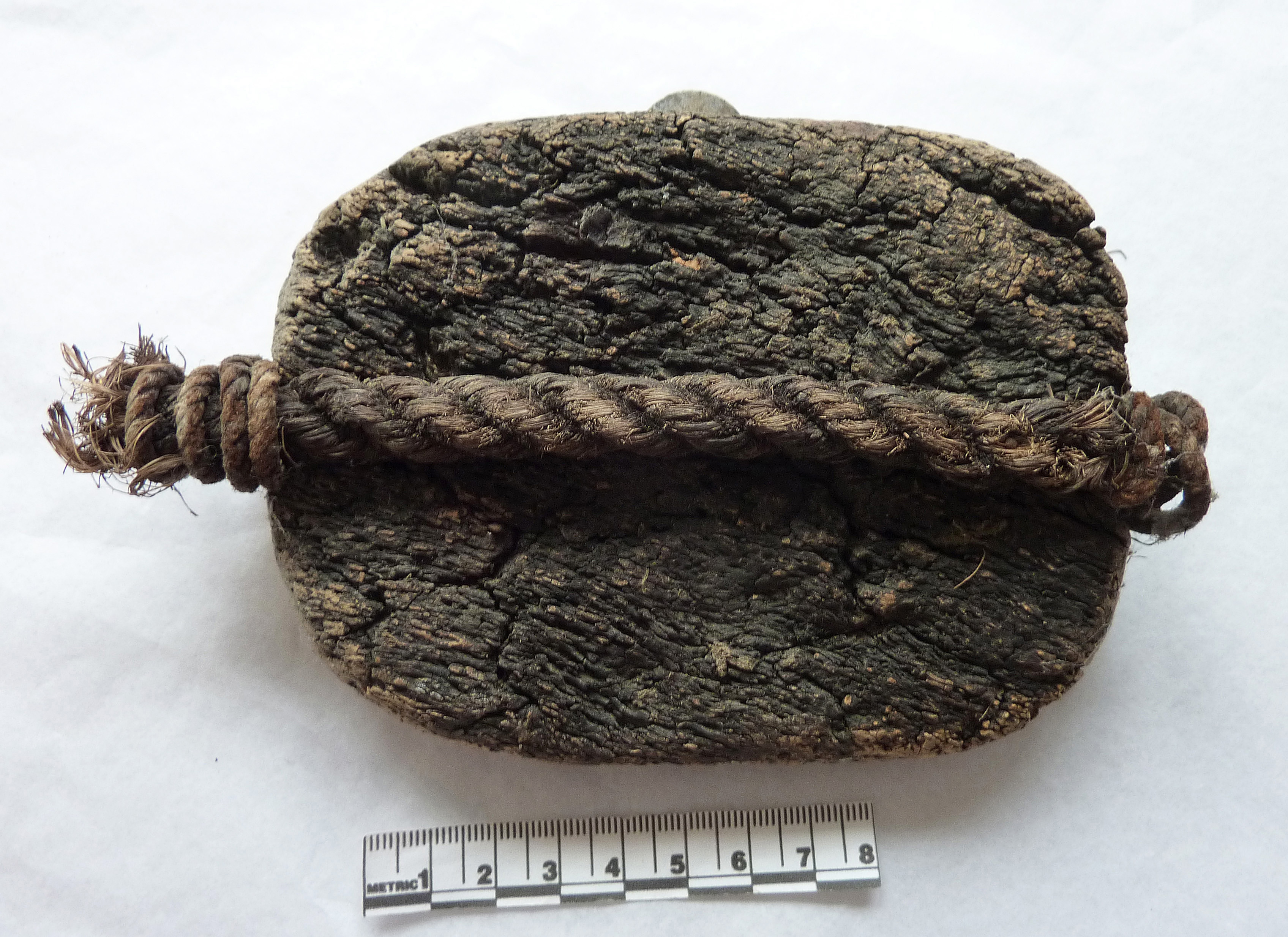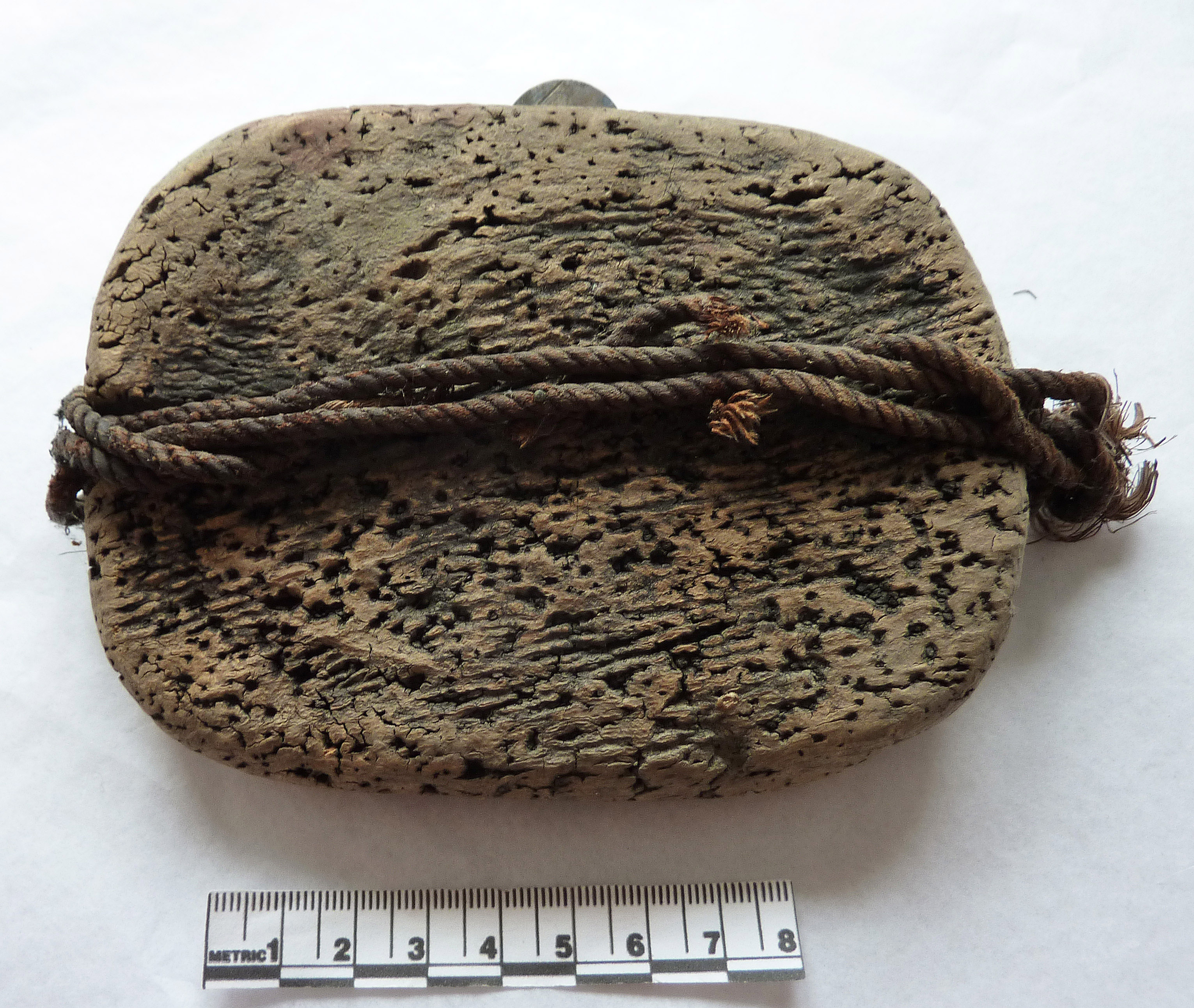 Original text by Cecil Williamson: 'Sea witch stimulated charms, spells, superstitions etc., are numerous, one line of belief being that it was necessary to offer to pay the sea gods or sea spirits for the fish that you took out of the sea. To do this a silver coin was inserted into a cut made in the edge of a cork net float. Should the silver coin fall out in the course of fishing, well the sea spirit had taken its payment. But if the coin remained firmly in place the gods had no need of your money and were not offended. If not of silver then the coin must be multi-holed as in the example seen here. The red pin marks the place where a silver threepenny piece has been inserted in the cork float. From Mevagissey, Connie Puckey.'