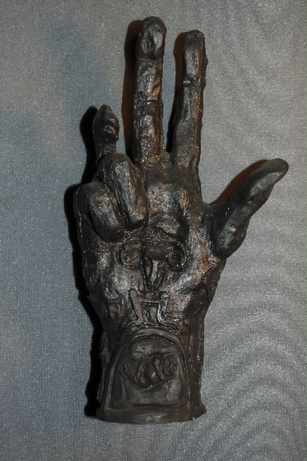 - Replica of a Roman bronze protective hand, incorporating a ram's head and other symbolic shapes. Plus a picture of another example of this hand,