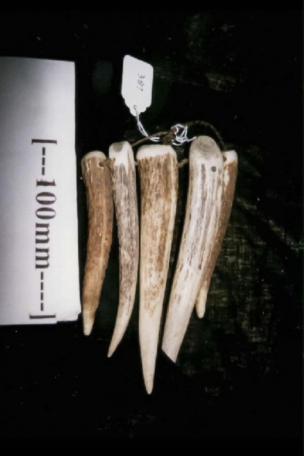 5 pieces of antler tine linked with twine.