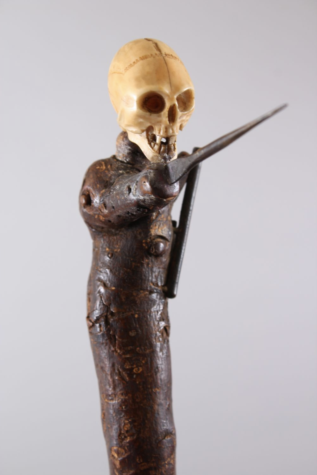 A mid 19th century cane with a metal tip, mounted with a carved ivory skull figure with affixed metal weapons - an axe and a sharp metal spike - to resemble a skeleton warrior.