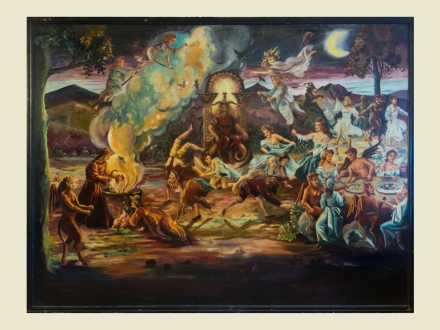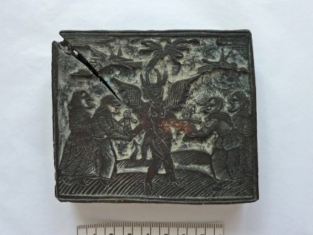 - painted jardiniere with detailed scene of Faust and Mephistopheles