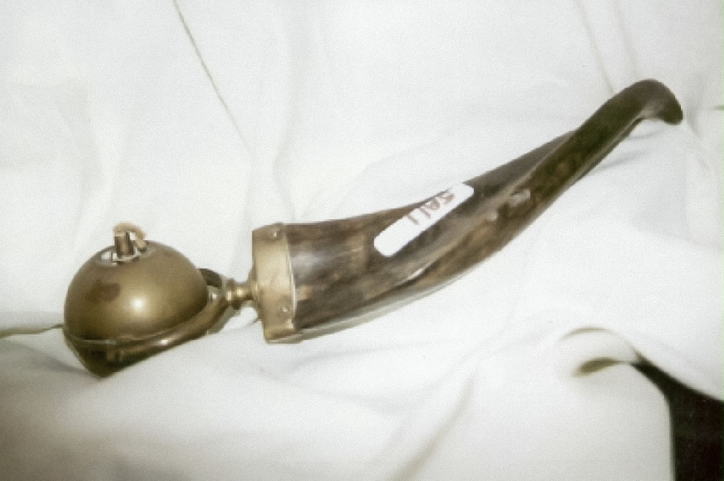 - A beautiful and ingenious oil lamp - the handle made of an animal horn, and the lamp itself consisting of a brass sphere, attached so that it swivels to remain upright whatever the angle of the handle.