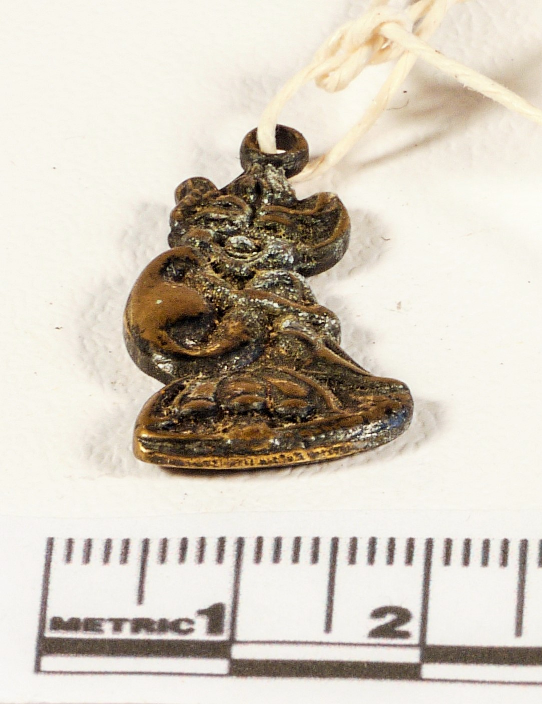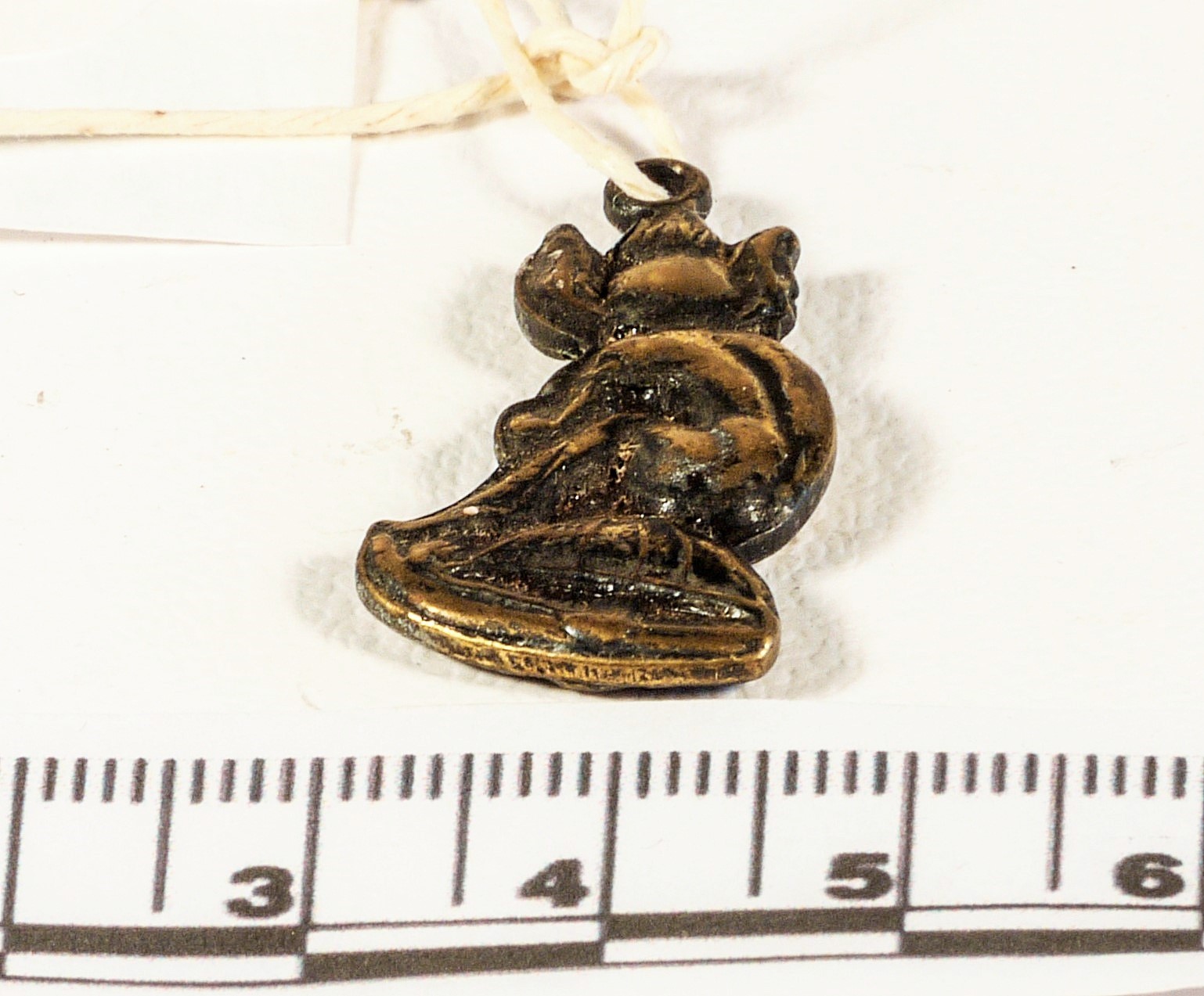 This object was found in a box labelled 'war time charms'. It was attached to a display board together with other animal-shaped charms. 2317-2320 were attached to the same board and others had become detached. I suggest that this object may have originally been collected by Edward Lovett, who collected and wrote about WWI soldiers' mascots. Imps were a popular lucky charm motif. Lovett also wrote about 'modern commercial amulets'. There is an imp charm in the Scarborough Museum Trust's Clarke collection and although it is not the same, the label says 'one of several variants'. T. Cadbury, 16/09/2011.