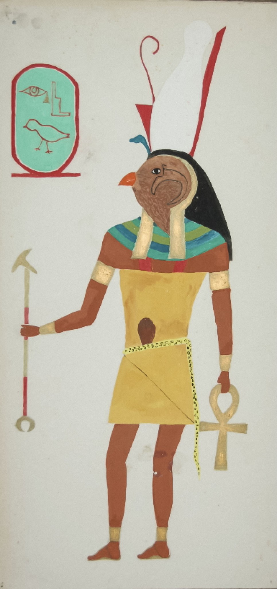 - Painting, probably in acrylics, depicting a falcon-headed Egyptian God wearing a tall crown (probably Horus). With the name Alex written on the back.