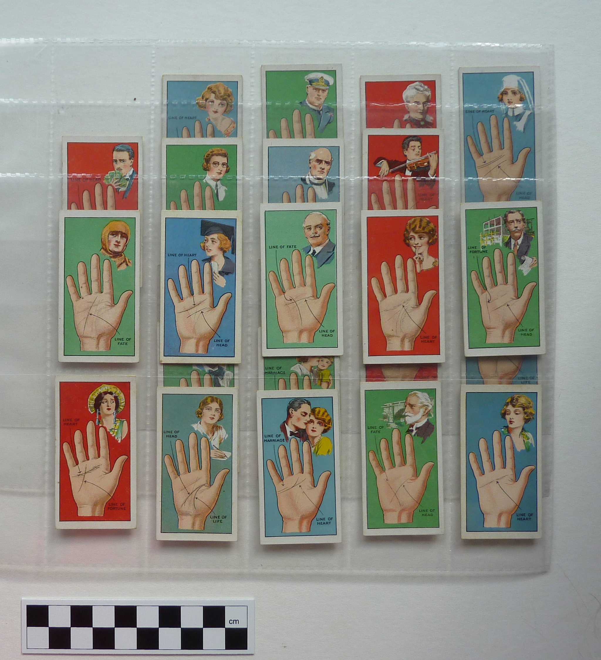 - A set of 24 Cigarette Cards, which each have on them a picture of a hand, showing lines on the palm, and in the background a picture of a person indicating a profession, personality etc. There is an explanation on the back of each card.