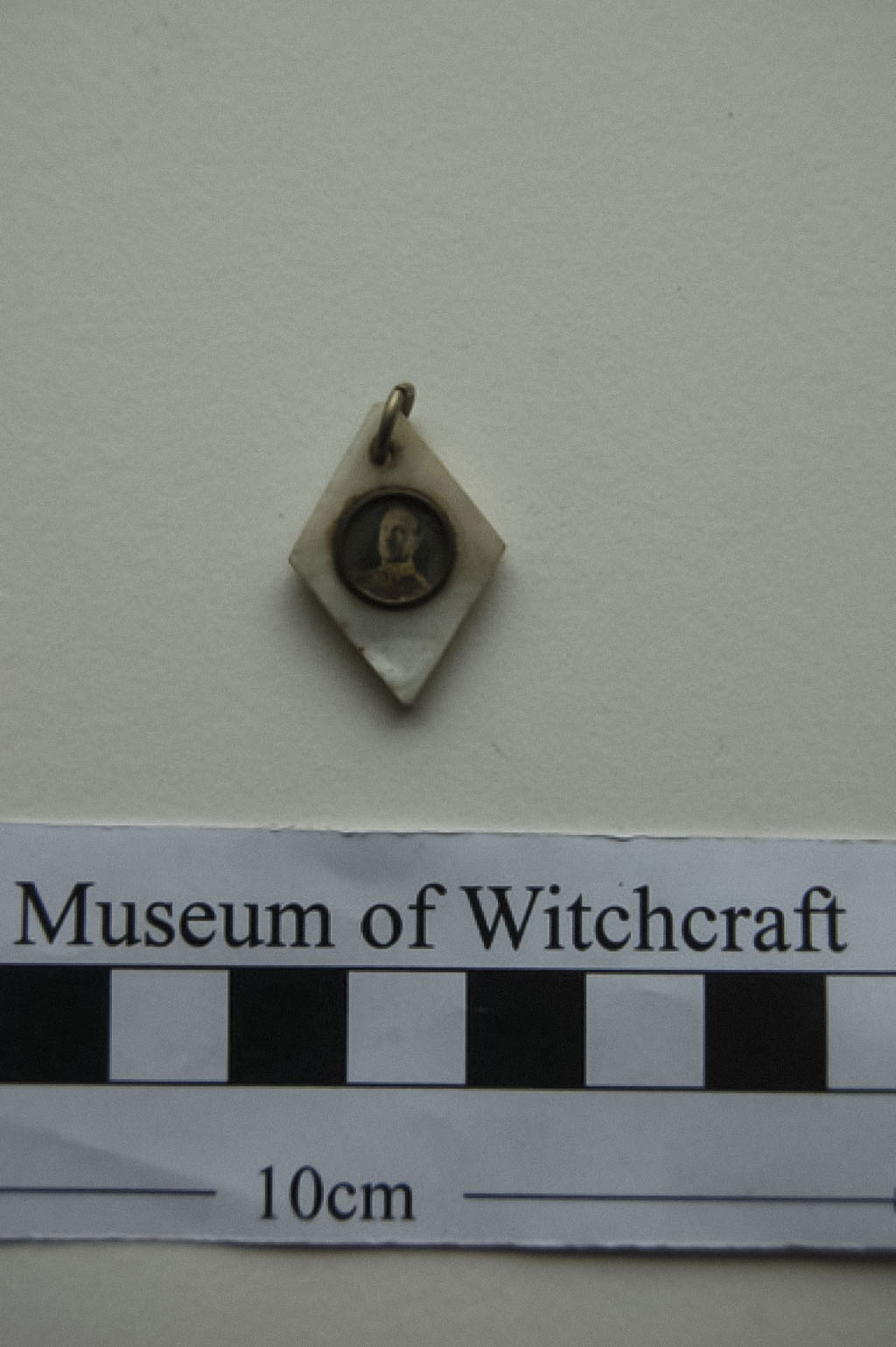 Diamond-shaped mother-of-pearl pendant, perforated for a metal suspension ring at the top. Brass ring at centre containing a portrait of an official-looking, balding man in a golden collar. The portrait is printed and looks as though it may have been cut