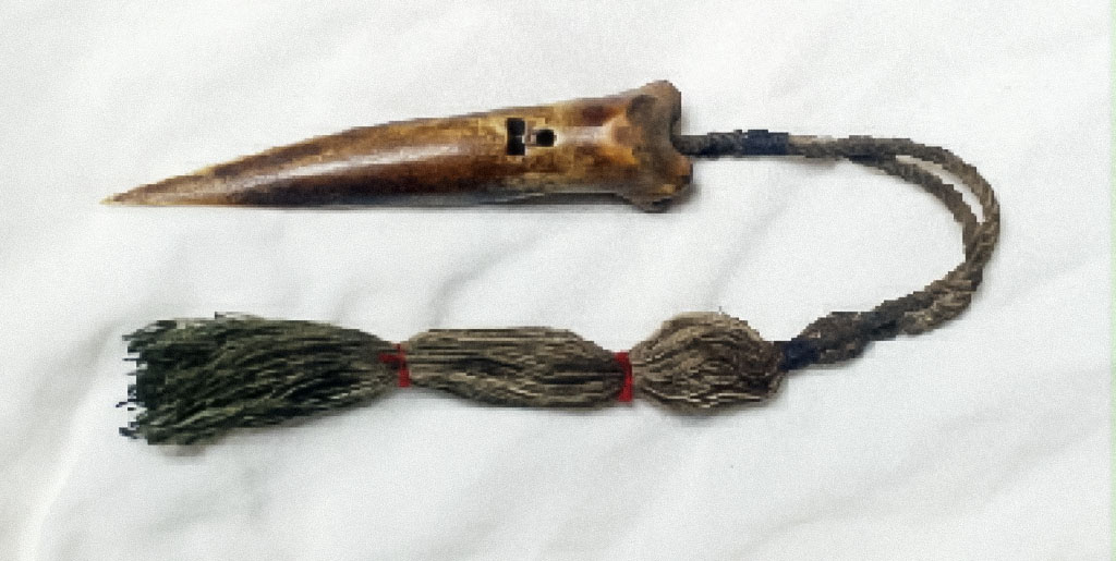 Bone pendulum with point carved in one side with 3 holes in the back and a cord attached with a tassel bound in red cotton. Displayed in an open box.