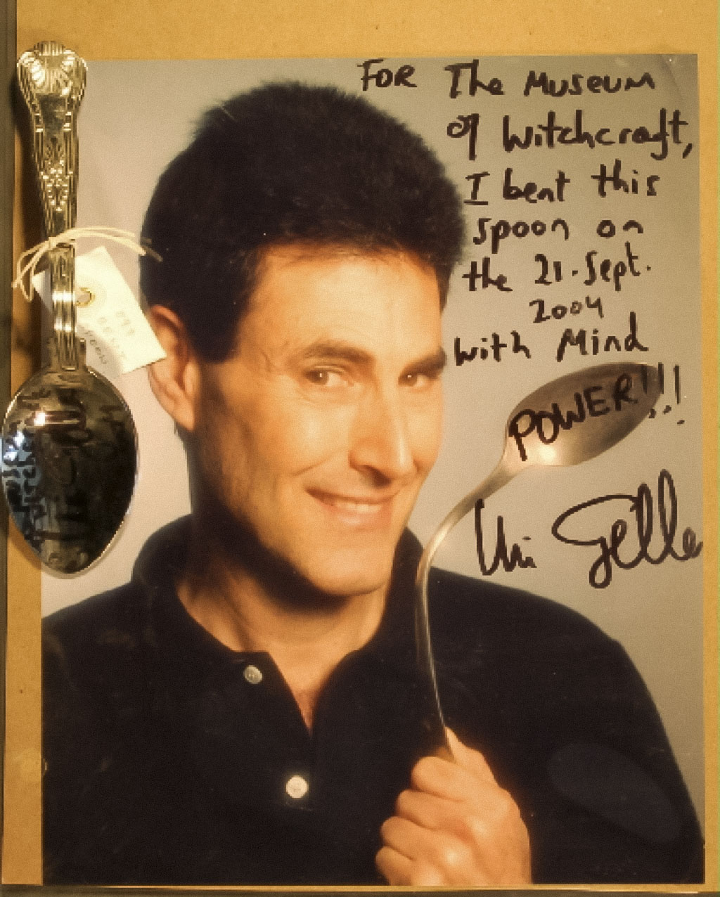 Colour photograph of Uri Geller holding a bent spoon, with autograph and message.