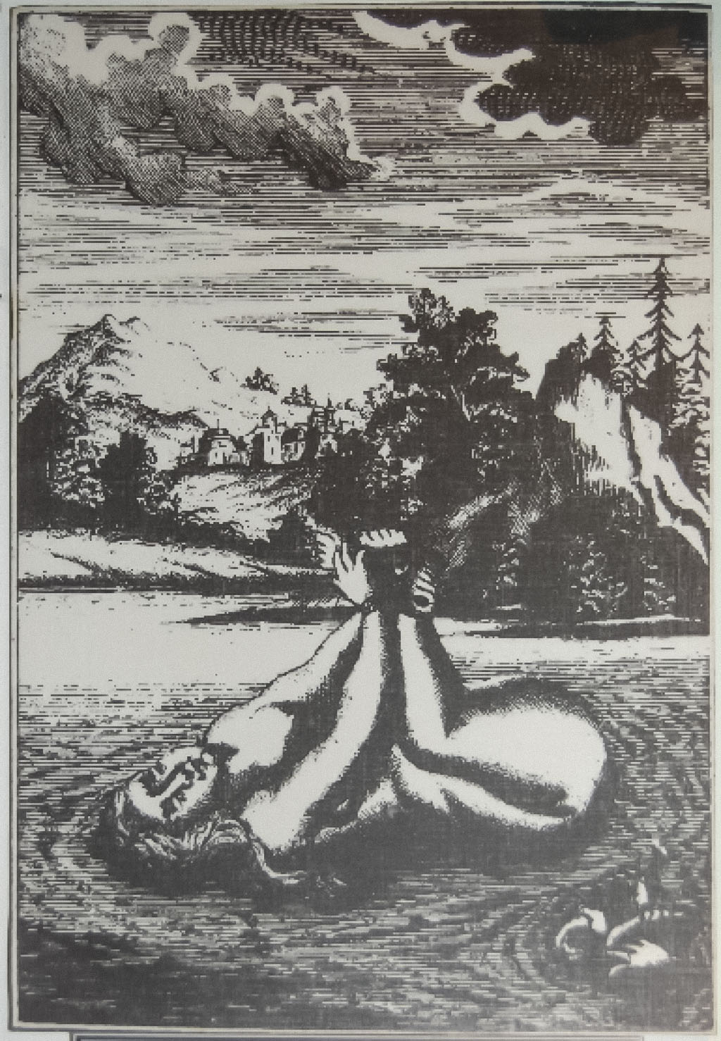 - Reproduction of a 17th century German engraving showing a bound woman floating on her back in a river, with the hands and feet of a drowning woman alongside.