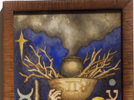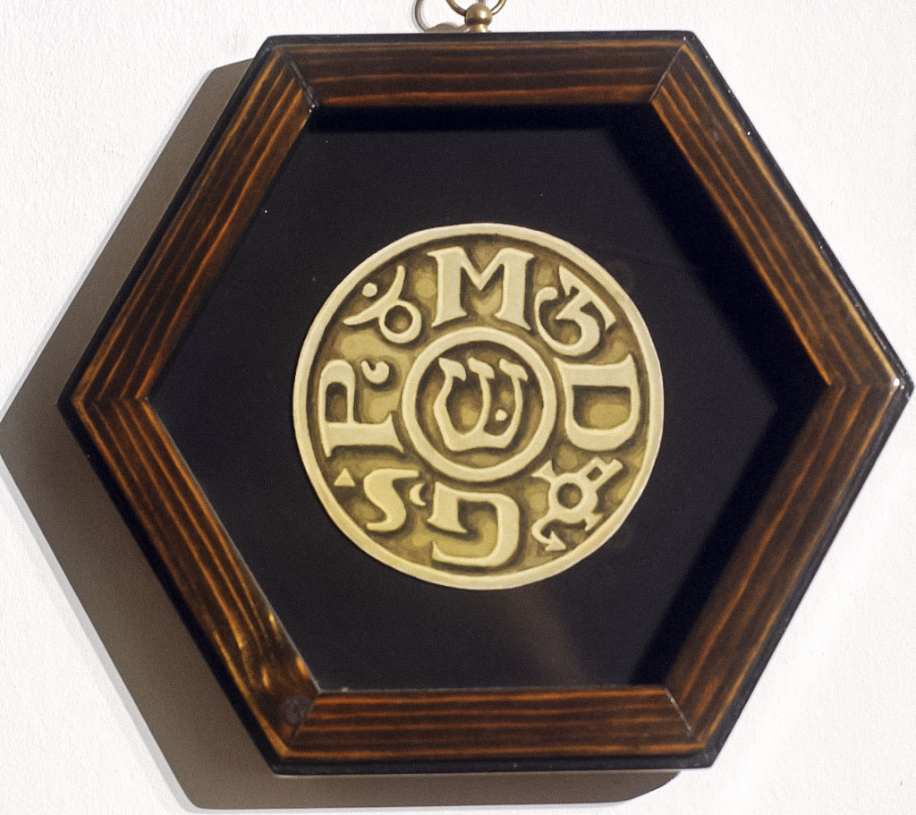 Hexagonal picture of amulet with Hebrew text anf Symbols.