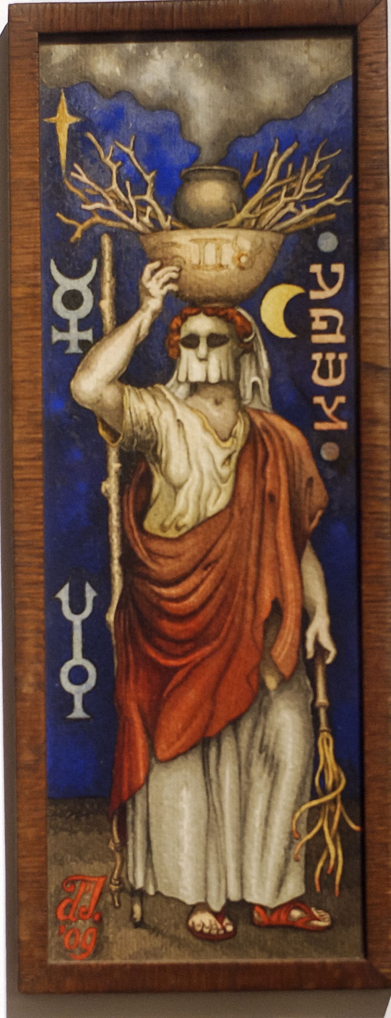 - Colour photocopy of picture of man with scourge and staff with bowl on head, containing sticks and smoking cauldron.
