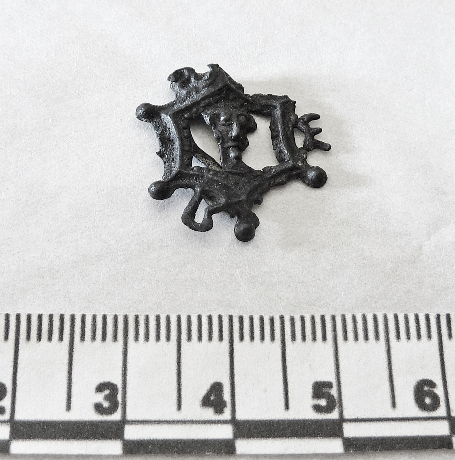 - A very dark grey pewter Pilgrim badge or lover's token, with an almost cartoonish male face in the centre, surrounded with a roughly hexagonal frame. 14th or 15th century.