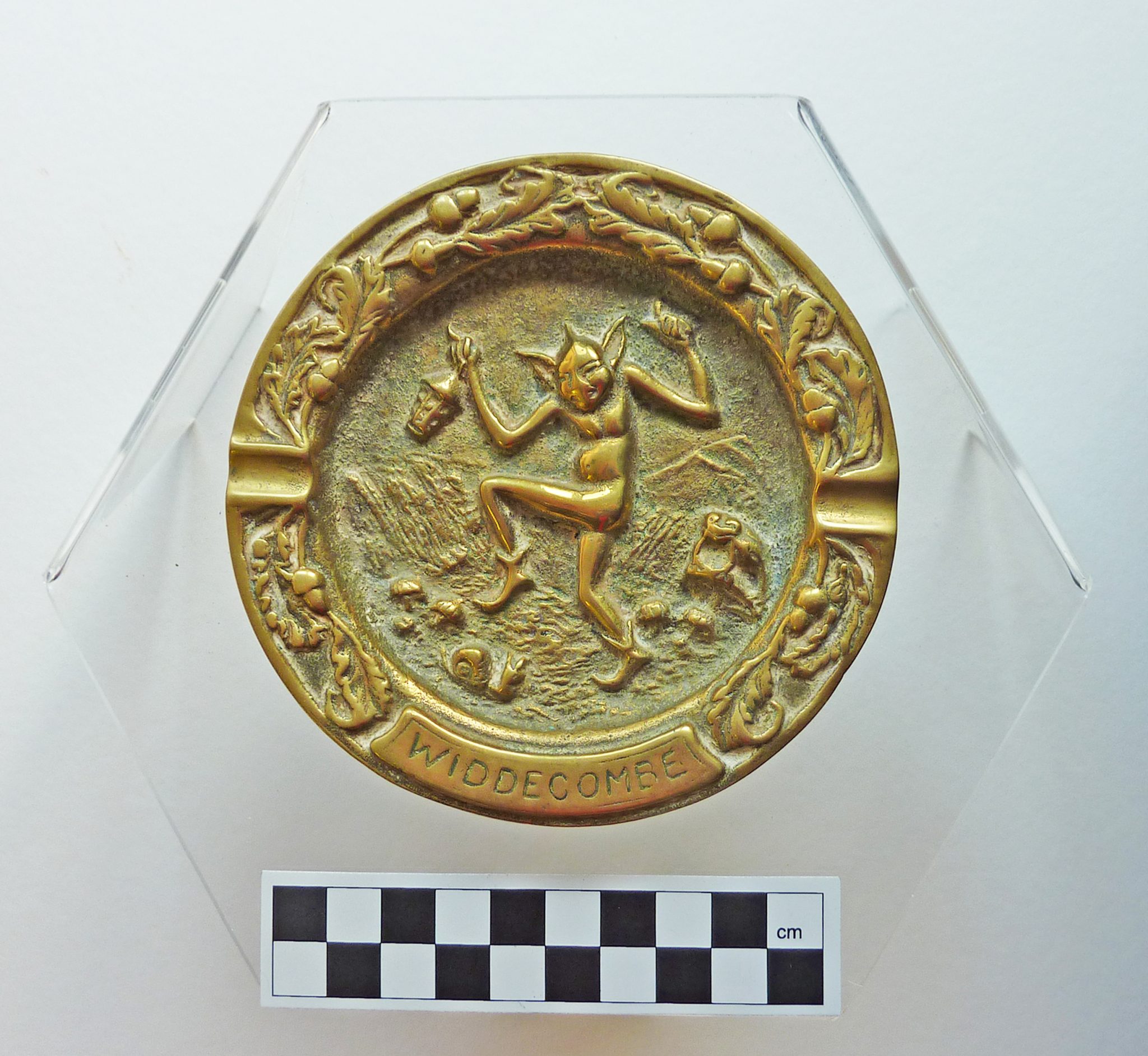 - A round brass tray with the figure of Jack O'Lantern, the King of the Devonshire Pixies, in the centre. He has long ears and appears to be dancing, and is holding a lantern in one hand. There are moors and a tor in the background, and a toad, a snail and toadstools around him. The name of the Devon town Widdecombe is inscribed on the rim, which also has a decoration of oak leaves and acorns. The rim also has indentations for resting cigarettes, indicating that the tray is an ash tray.
