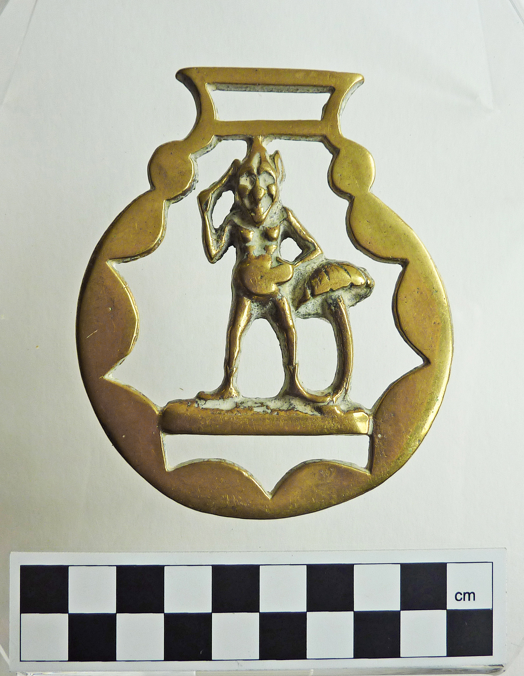 - A horse brass with a fairly plain scalloped surround, but featuring the figure of a Pixie in the centre. The Pixie appears to be naked apart from short boots and a pointed cap, and is scratching one of his ears with a twig or straw. He is leaning on a rather tall toadstool.