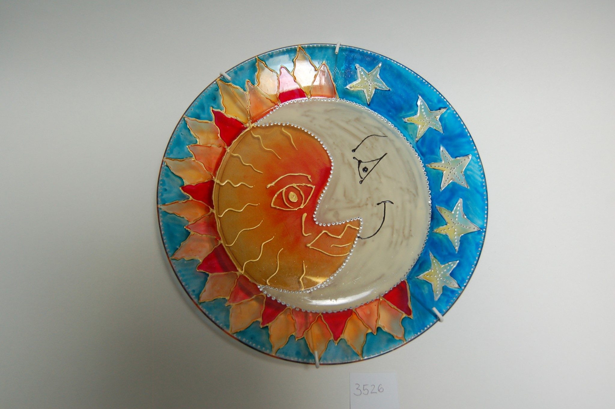 Very colourful painted glass plate depicting the Sun and the Moon as faces touching.
