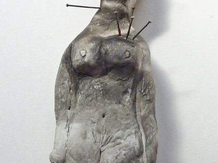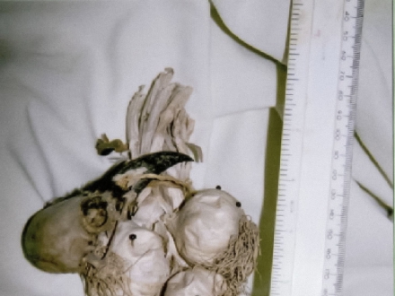 - A wax poppet, apparently of a vicar, dressed in black fabric clothing and with human hair attached to the head, and pierced with a large number of pins. The poppet is lying on a stylised couch inside a glass-fronted box, with a painted backdrop showing a church. From East Sussex. Early 20th century.