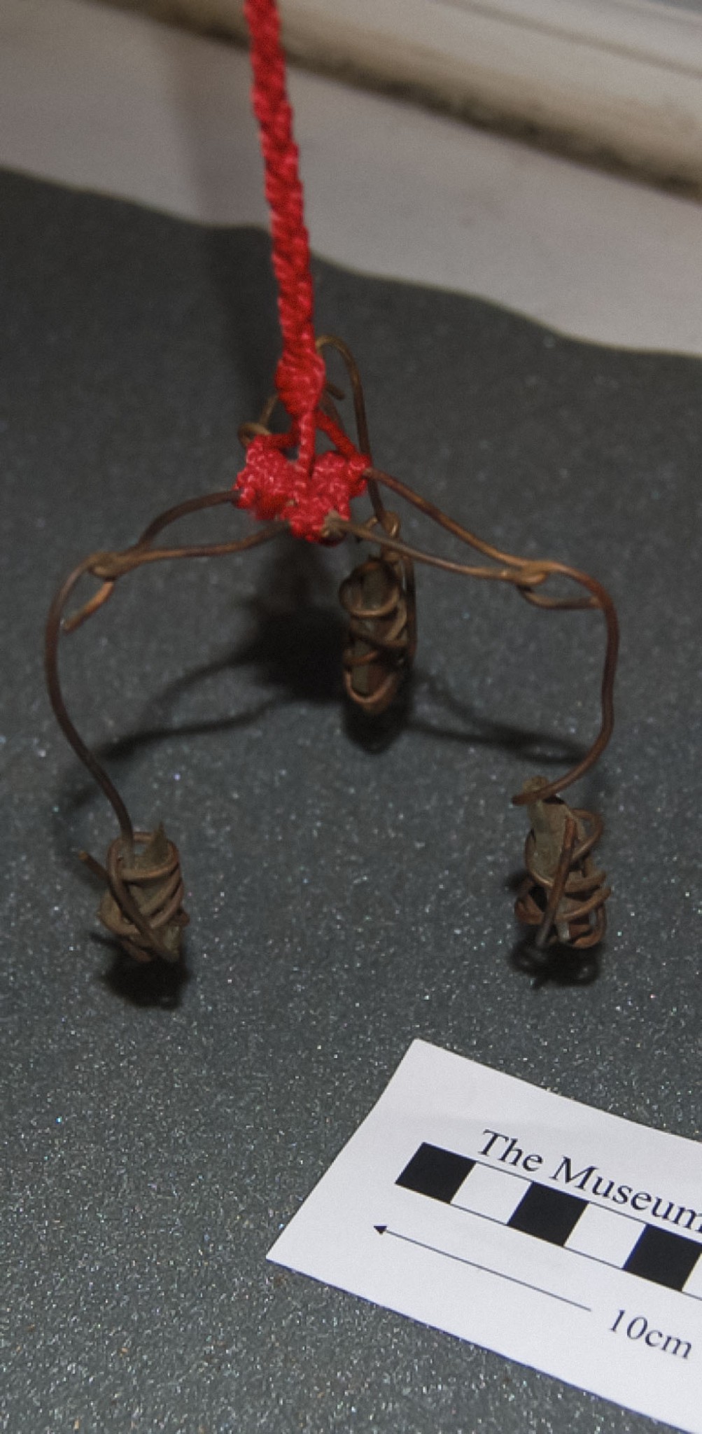 A charm to avert the Evil Eye, consisting of three pieces of mirror glass bound in copper wire, hanging from a rather elegantly constructed three-armed wire holder, which is bound with a red cord then used to hang the charm up in a house.