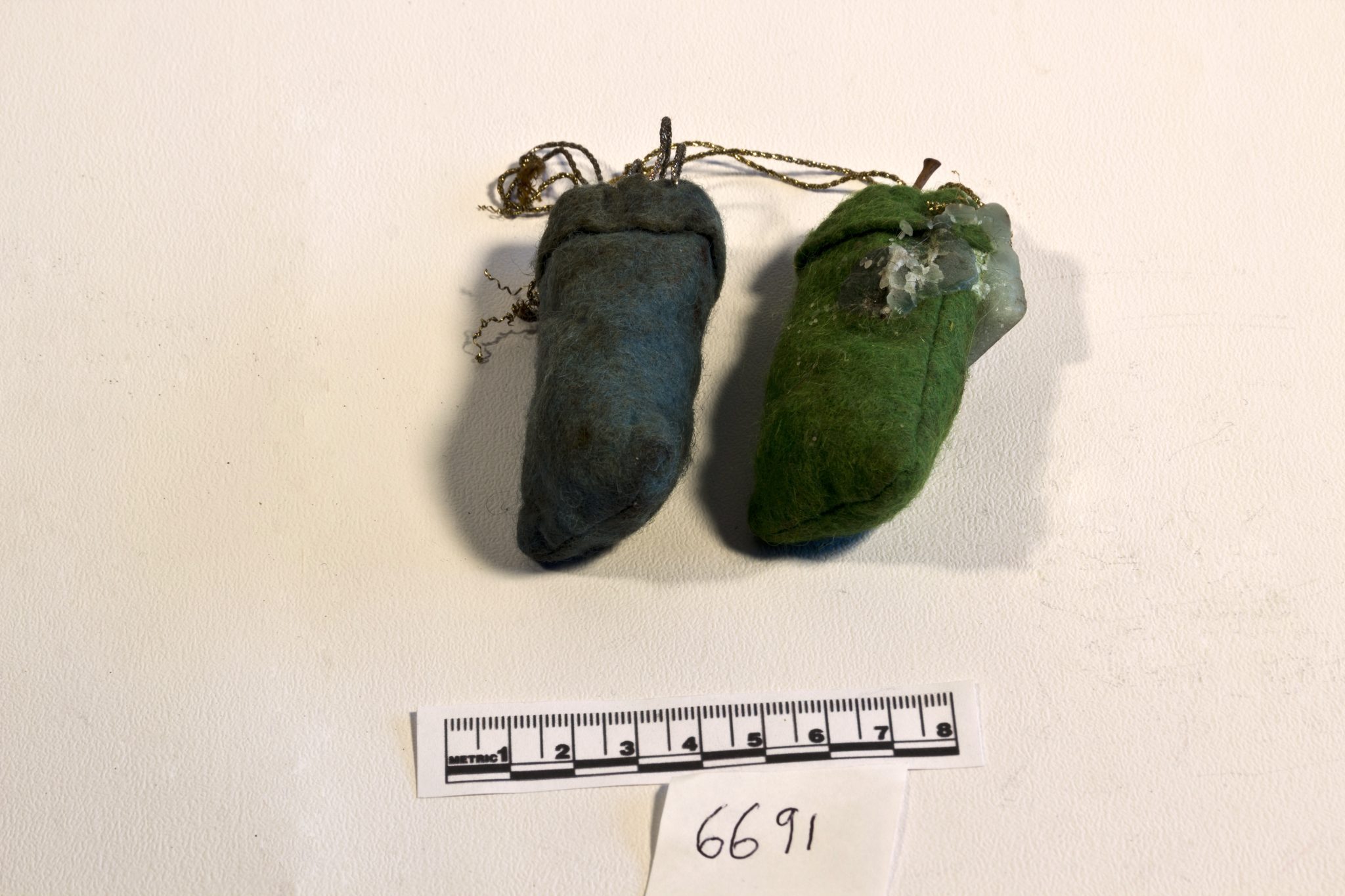 - Pair of small cylindrical felt bags, one grass-green, one blue-green, with gold drawstrings; male and female, and containing 'First Matter' used in high ritual. The grass-green one has pale green wax on the outside.
