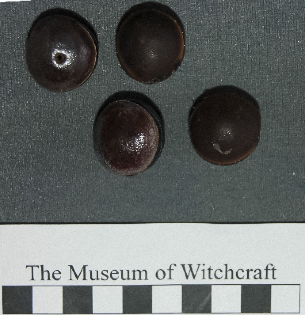 - 4 sea beans, round and dark brown with a black band. Possibly used as amulets.