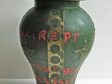 - A shallow pot with a (sealed) lid, glazed a shiny purple colour, and probably originally a small casserole. The lid is notably less shiny than the body, and is inscribed with words and symbols using red paint. When the pot is tilted small objects can be heard moving inside it.