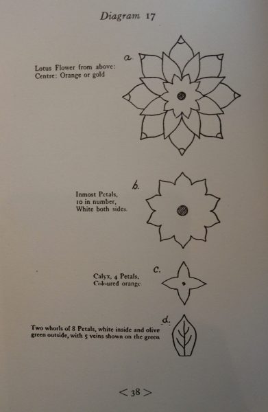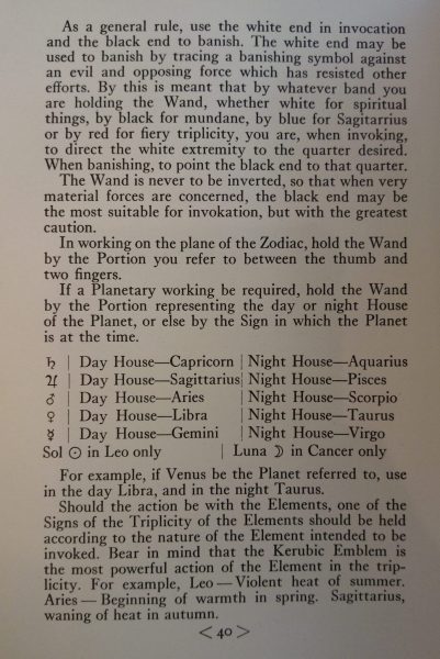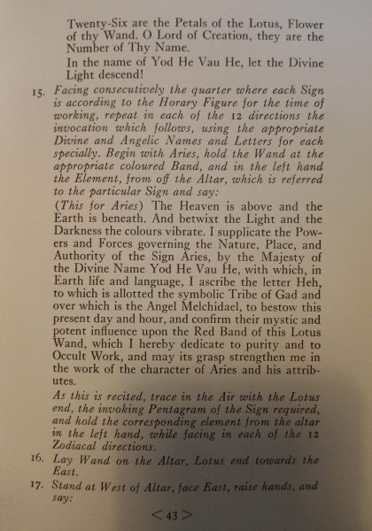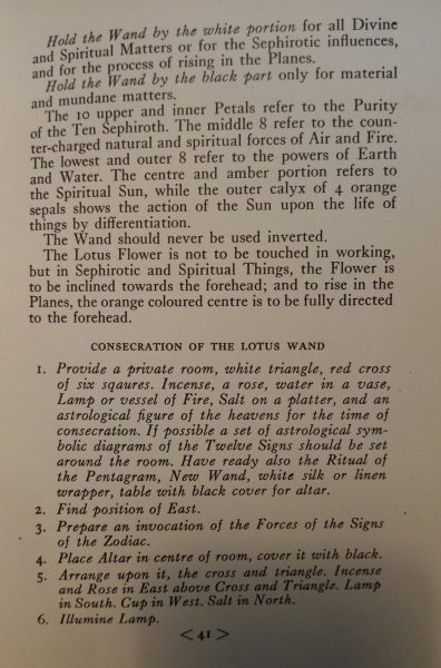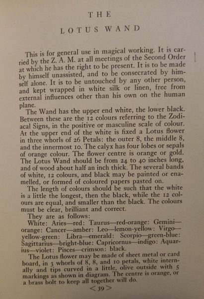 The lotus wand is a ritual tool that the Adept (member grade of the order) uses in the Golden Dawn system. The shaft of the wand is divided into 12 parts, each with its own colour, and a corresponding zodiac sign, as pictured below.