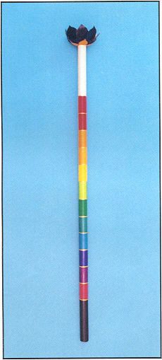 - Golden Dawn staff, slightly longer than usual, with a green-petalled lotus top, and the handle divided into bands of the colours of the rainbow.