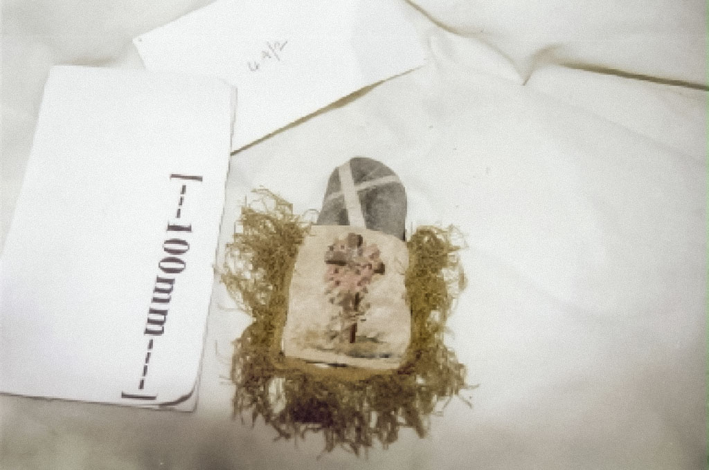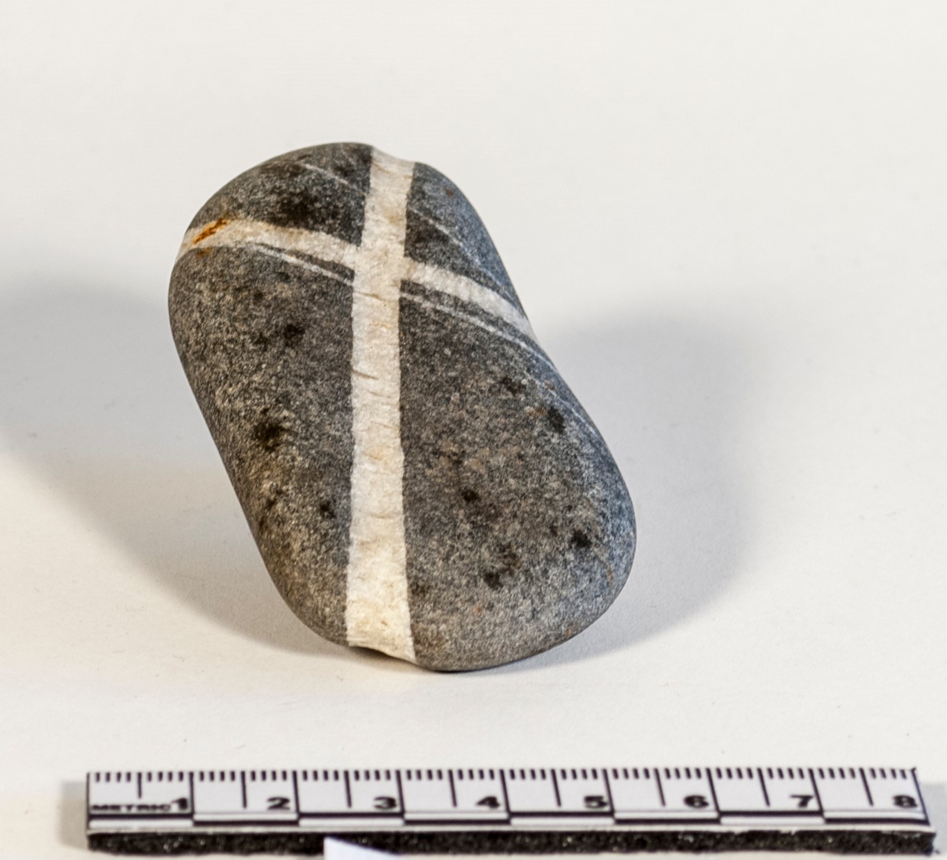 Slate pebble with white quartz cross-shaped marking, in a handmade pouch with a cross design and fringed braid edging. Pouch lost in 2004 flood.