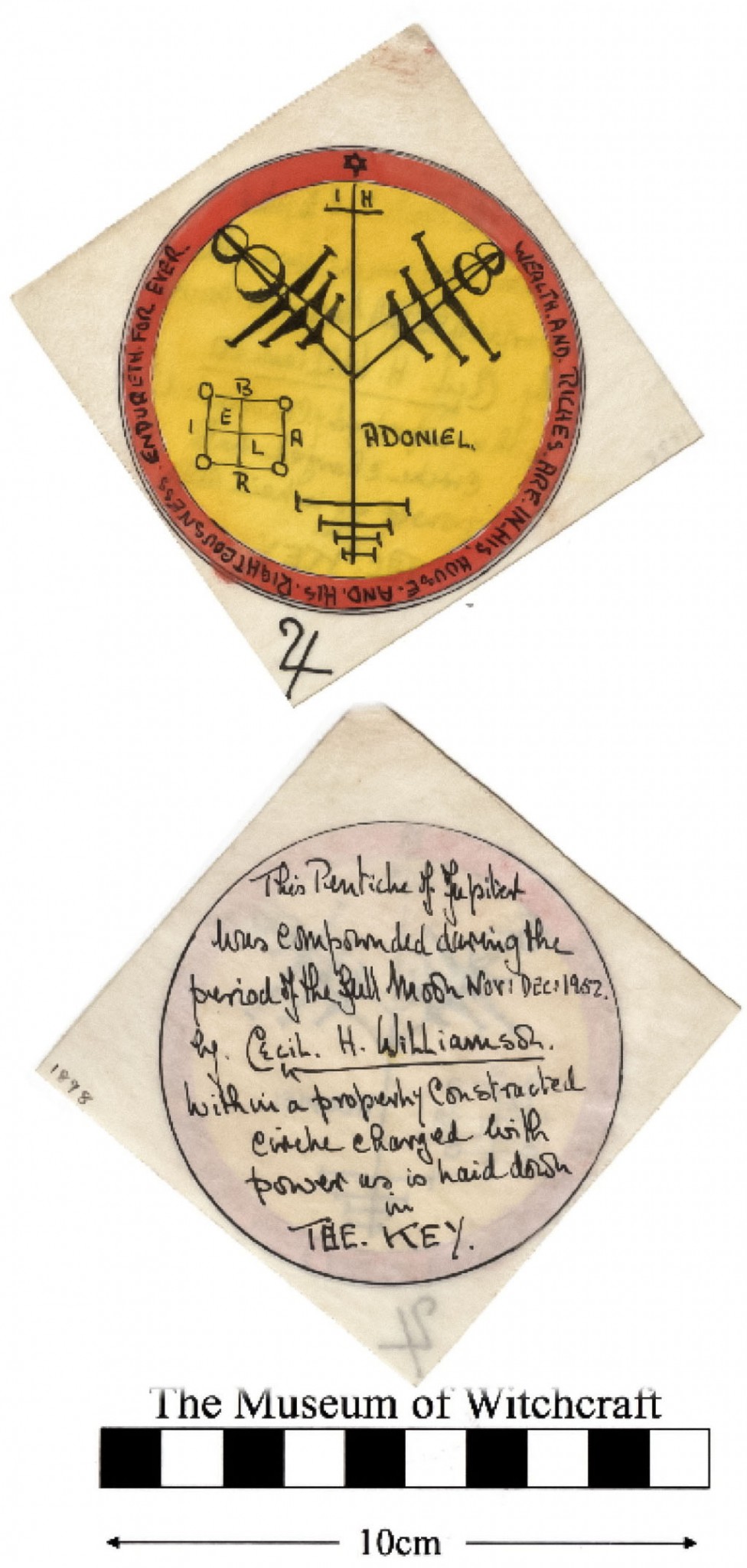 A note on the back reads, 'This Penticle [sic] of Jupiter was compounded during the period of the full moon Nov: Dec: 1952 by Cecil H. Williamson within a properly constructed circle charged with power as is laid down in THE KEY.'