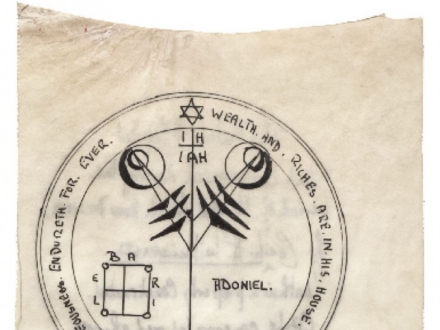 The talisman incorporates the names of the Angels Adoniel and Bariel, and the words, 'Wealth and riches are in his house and his righteousness endureth for ever' (Psalm cxii.3). According to the Key it will bring riches, honour and wealth.