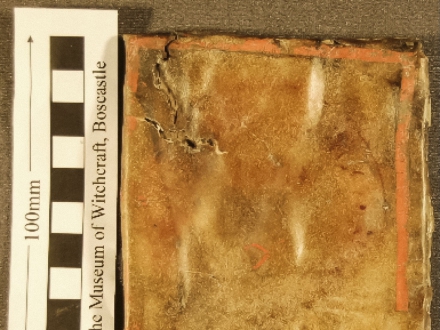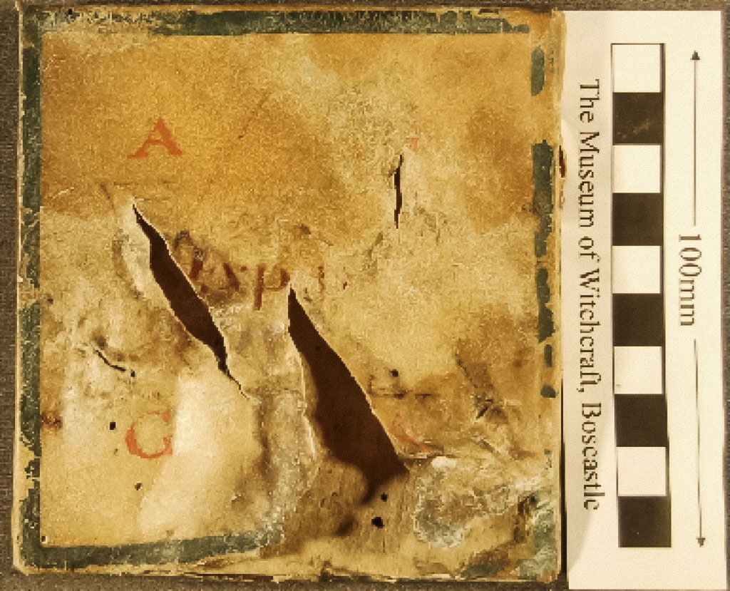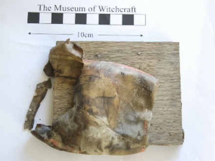 Old square parchment talisman, mounted on wood, with 6-pointed star, AGLA, and other illegible writing.