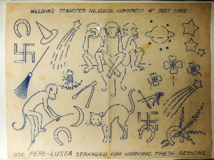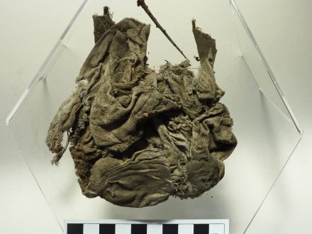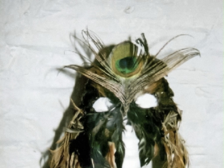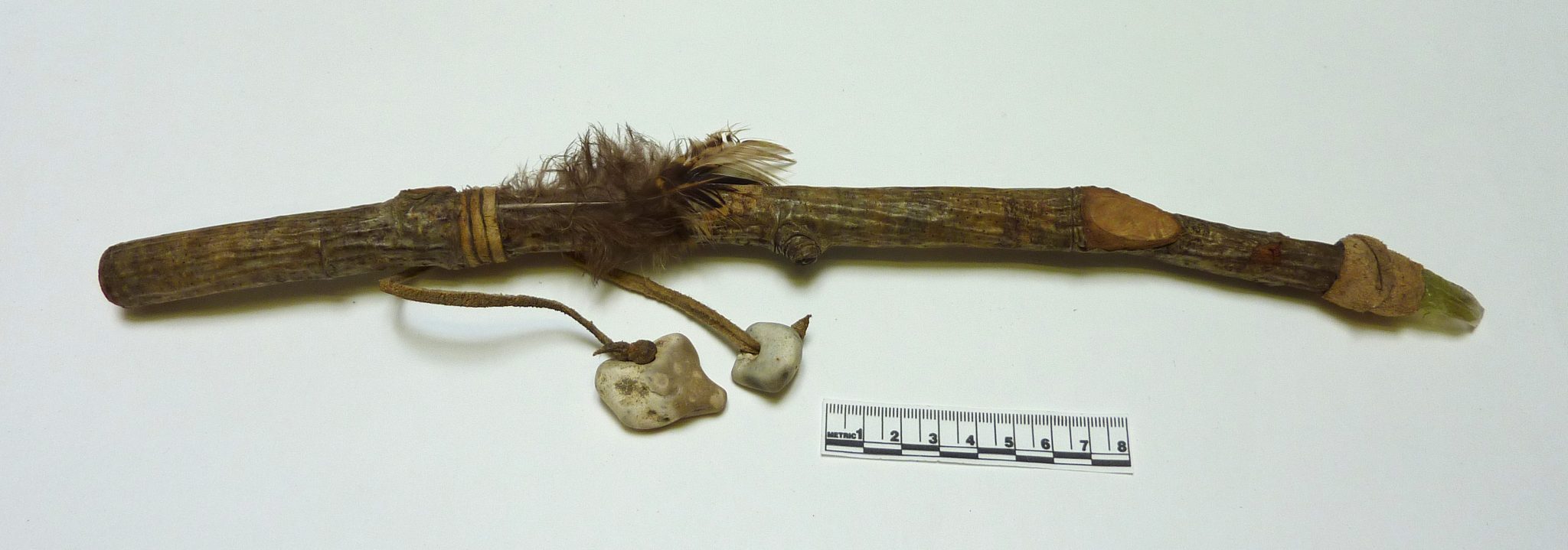- Wand made from a piece of branch with 2 hagstones tied on with a leather thong, a greenish crystal at the tip, bound on with leather, and a small pheasant's feather.