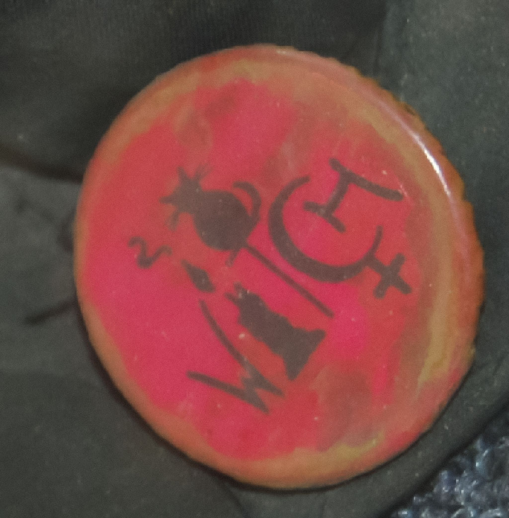 Pink badge with the word witch printed in black. The 'I' is in the form of a candle, the 'c' in the form f a crescent moon, and a cat sitting on the 't'