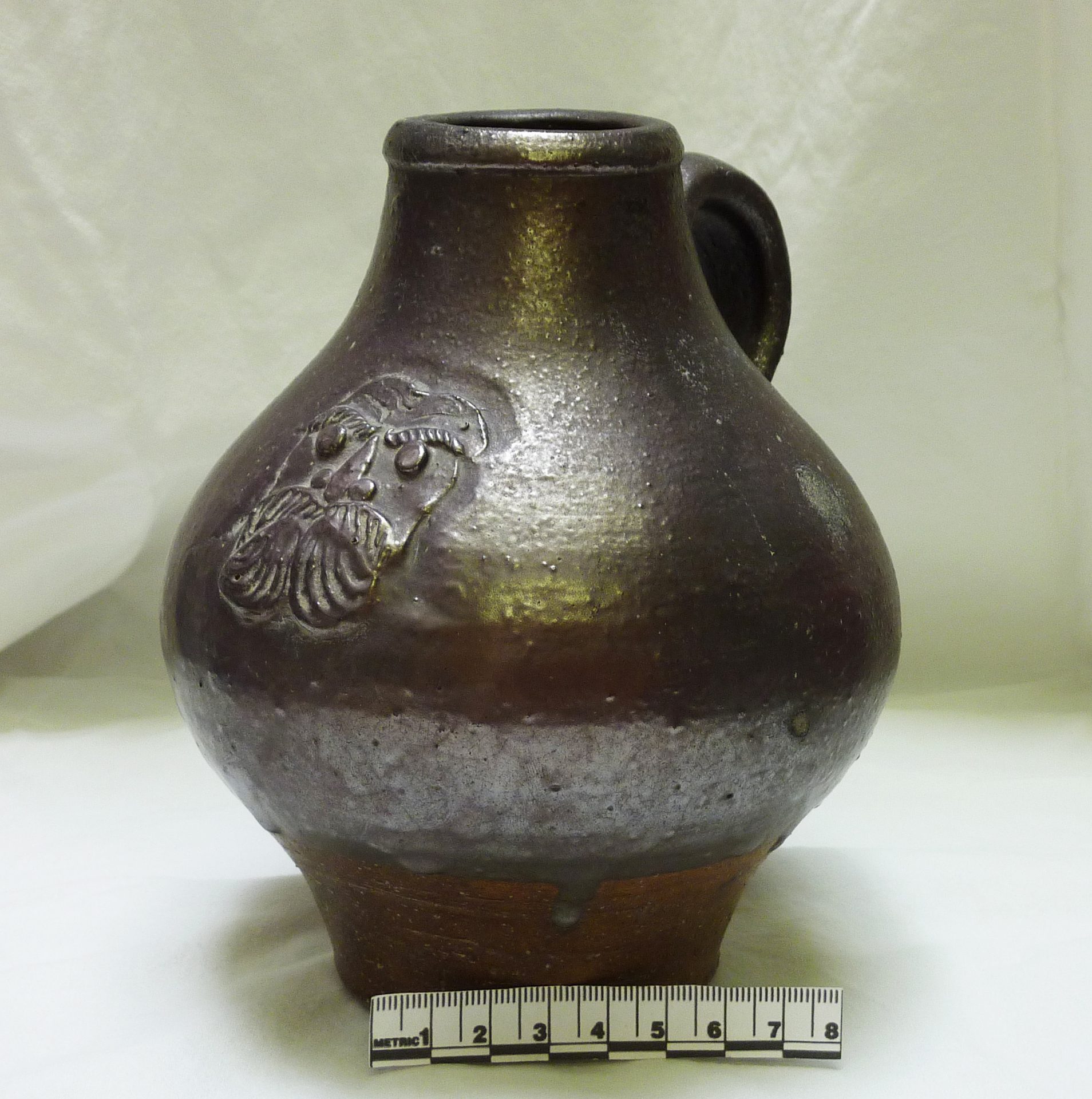 A pitcher type jar with bearded man's face - when found this jar was fitted with a wood bung stopper and sealed with wax. When opened it contained some stinking black liquid and a quantity of sludge. This mess was originally human hair and urine. Found concealed in a table tomb close to Exeter cathedral, 1950. (From original text by Cecil Williamson.)