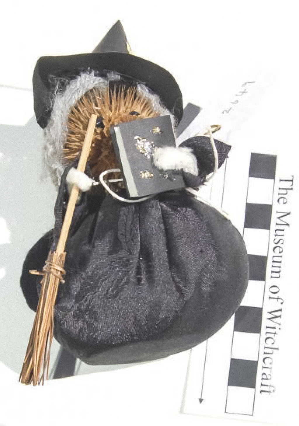 - Small witch figure with a teasel head with black bead eyes and nose, straggly wool hair, round fabric body, pipe-cleaner arms, a paper hat with gold stars, a black felt cloak, and holding a broom and a spell book. Essentially a kind of hedgehog witch.