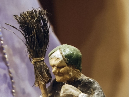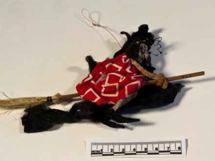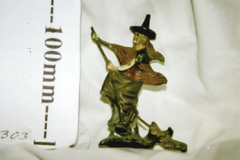 Original text by Cecil Williamson: 'Victorian child's nursery mantleshelf ornament of the traditional type-cast witch riding steeple-hatted astride her broomstick.'