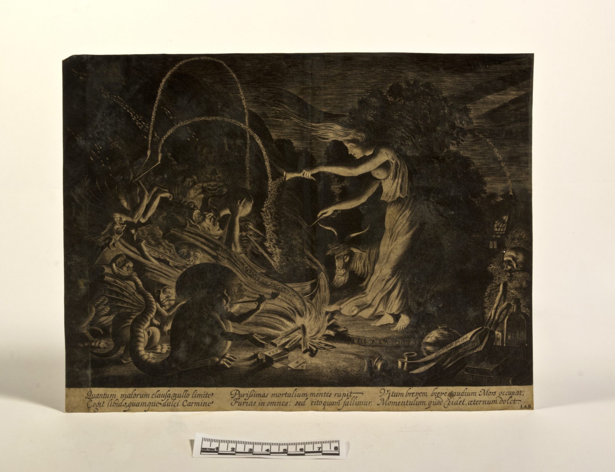 Interesting details include a goat standing behind the witch, and a skull, books and a large bottle at front right. The witch is holding a slender wand and pouring a powder from a horn-shaped container into the cauldron. Lines in Latin at the bottom describe the power of temptation and warn, 'You laugh for the briefest moment, you suffer the pain of regret forever.'
