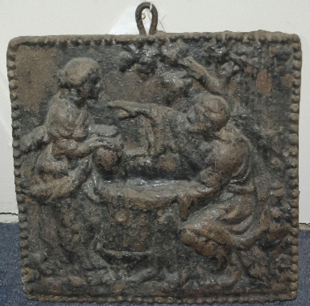 - Black cast iron plaque of Jesus and the Samaritan woman.
