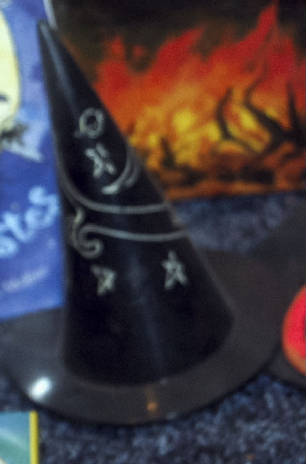 Small black plastic witch's hat ornament decorated with stars, crescent moon, saturn, a pentacle, and a cat.