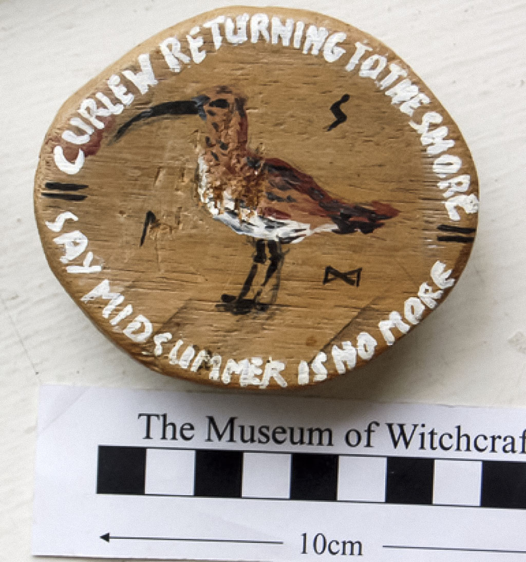 - Small oval wooden plaque painted with a picture of a curlew and the words, "Curlew returning to the shore say midsummer is no more."