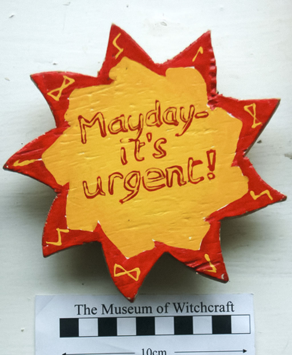 A roughly cylindrical piece of branch, attached to an iron spike, presumably to be used as a marker in rituals, painted with two pictures of a naked woman holding an apple, representing a harvest goddess, and a poetic inscription referring to Lughnasadh.