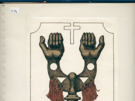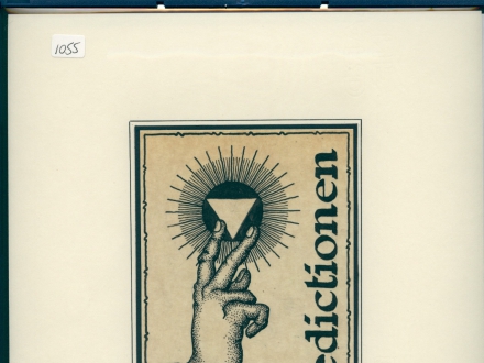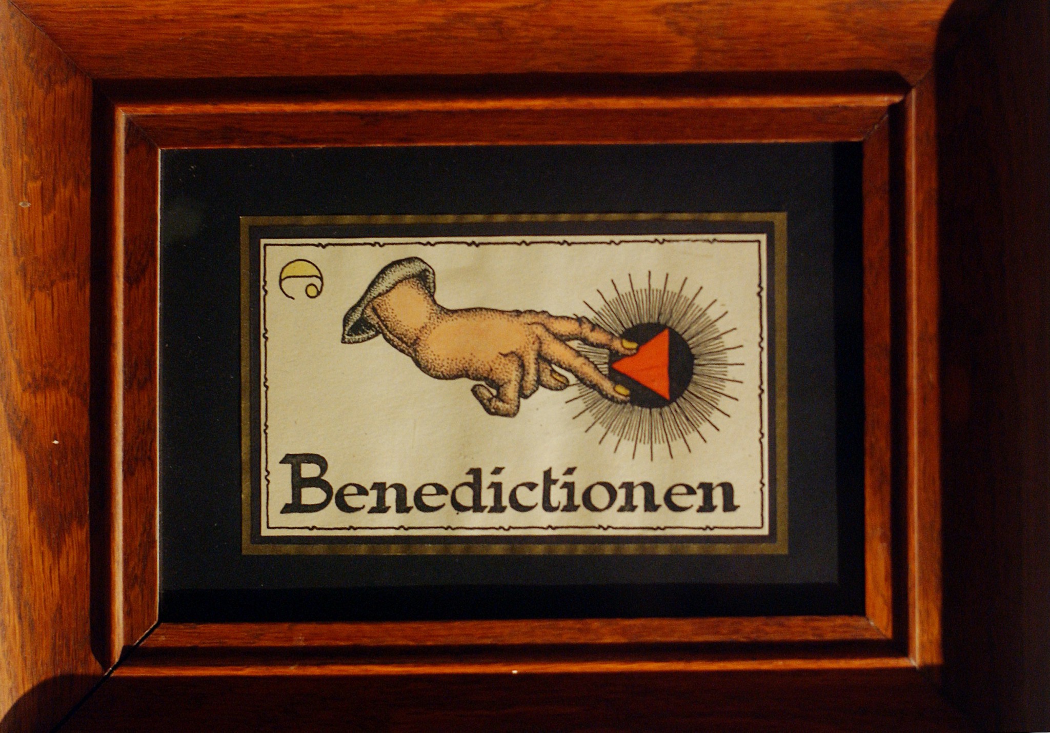 print of hand with a triangle and the word ‘benedictionen’ on reverse is a shadow hand picture and text ‘maledictus’