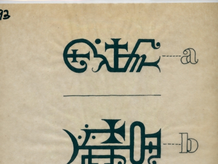 - Drawing of a knife, front and back and symbols