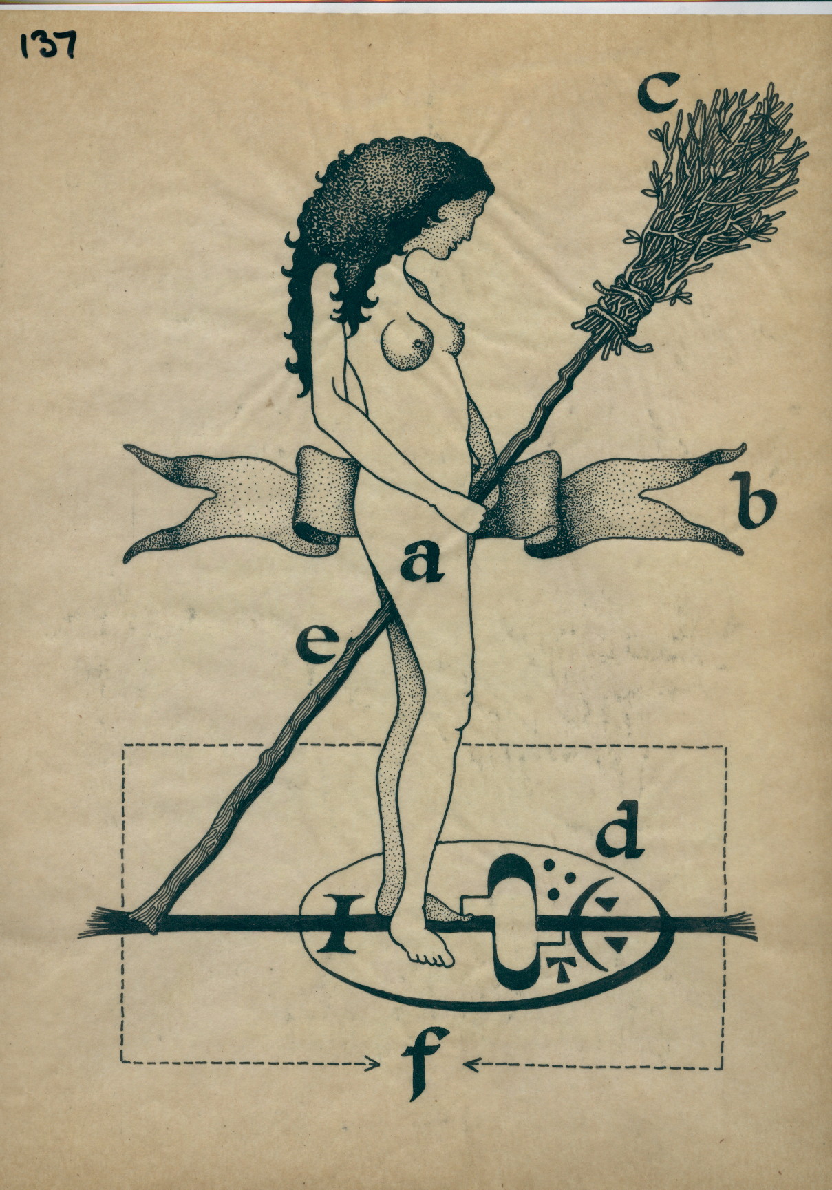 The woman ‘a’ stands in circle ‘d’ which has symbols in it. She holds a broomstick ‘c-e’. Behind her is a ribbon ‘b’. Around the circle is a square drawn ‘f’.