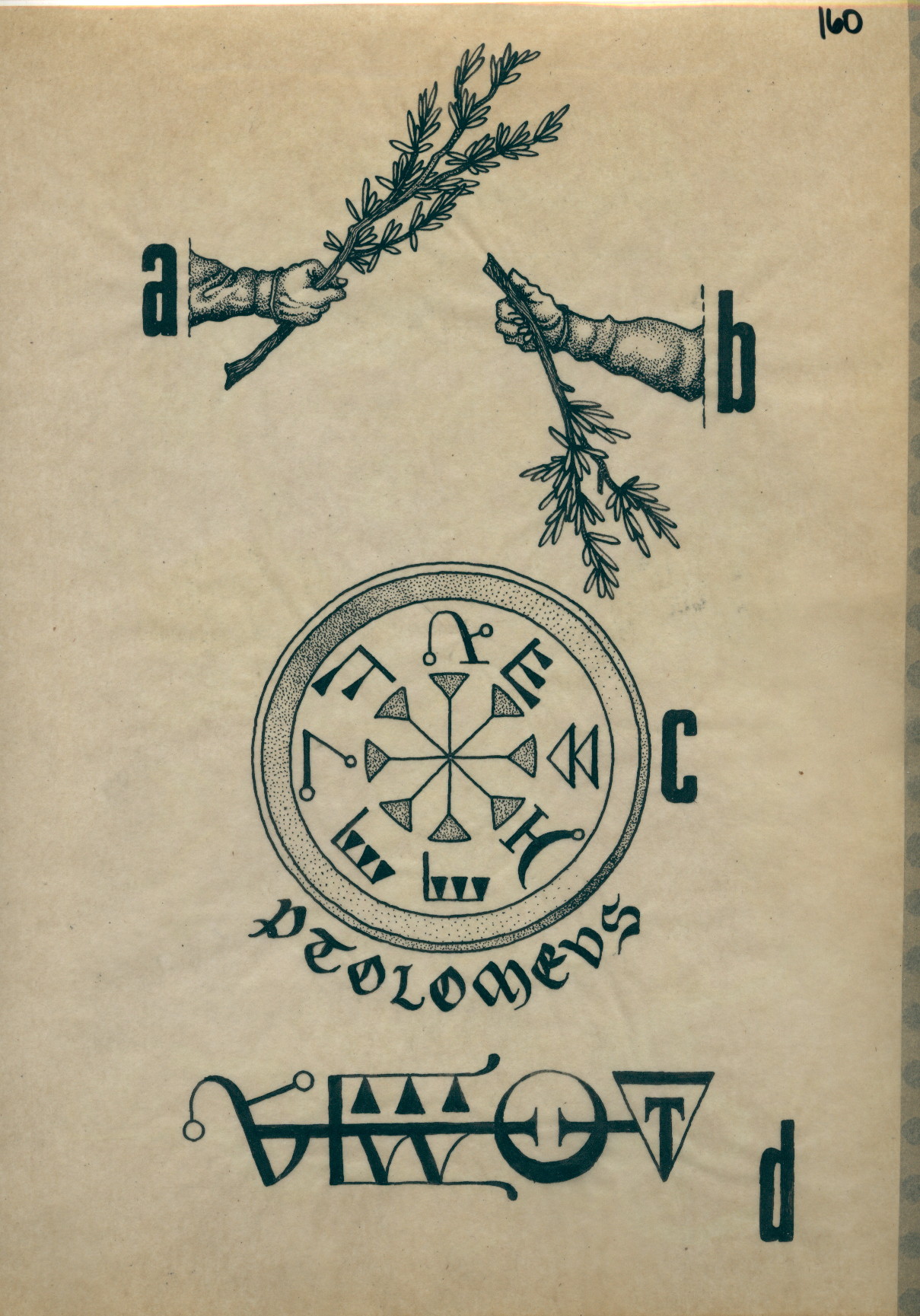 An arm holding a branch upward ‘a’. An arm holding a branch downward ‘b’. A circle ‘c’ with sigils and a word (ptolomeus ?) below it. And a sigil ‘d’.